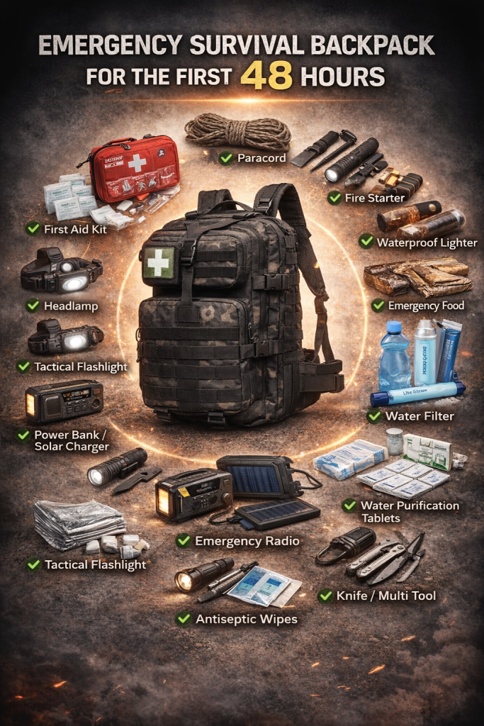 A fully equipped 48-hour survival backpack, built with carefully selected essentials to keep you ready, protected, and in control during emergencies and unexpected disasters.