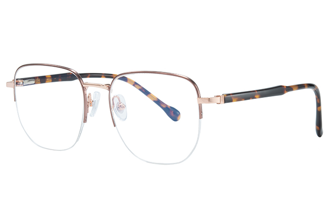 The half-rim geometric frame has two-tone color in gold and brown. Made with metal titanium and acetate, it is durable. Adjustable nose pads as well as the spring hinges provide a proper fit.