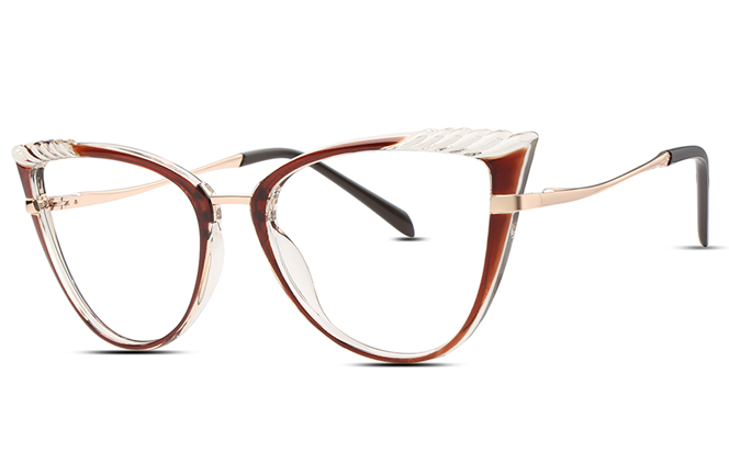 It is the typical cateye glasses. With the spring hinges, the frame will not press your head. There is special design which looks like wheatear on the top of the frame. Three colors available: black, tortoiseshell and brown.