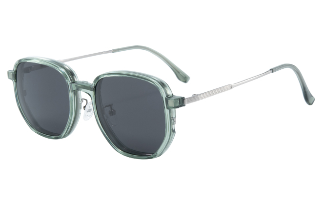 The unisex Geometric frame is made with metal and TR90, so it is very light. With the adjustable nose pads, it is comfortable to wear. There are three colors available: black, green and pink. The black and green frame has polarized green clip on. And the pink one has gradient orange clip on.
