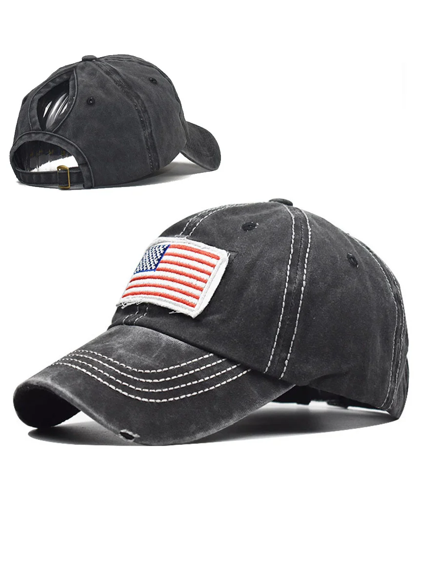 Distressed Denim Independence Day Flag Print Ponytail Ripped Cap