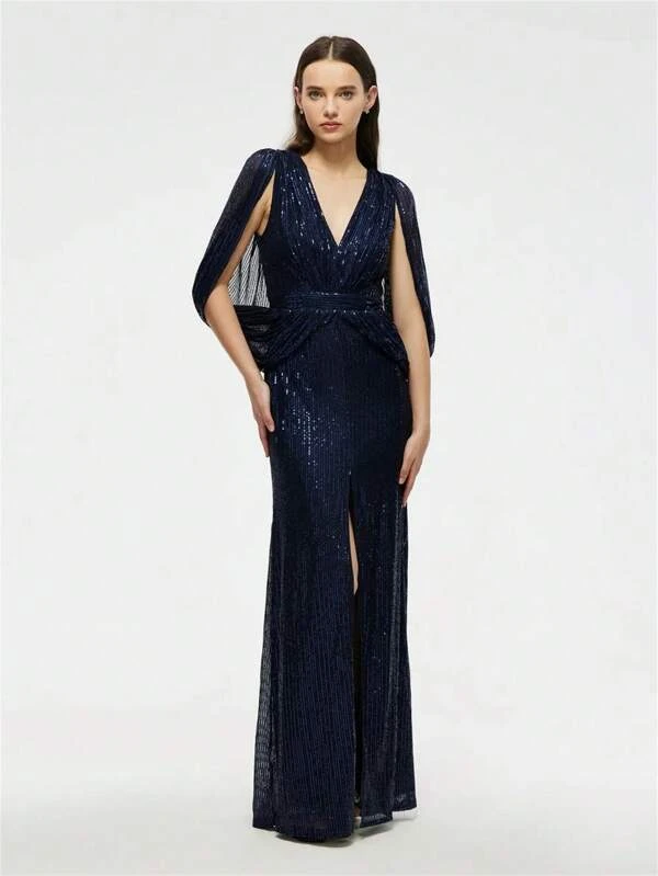 Sequin Formal Dress with Split Thigh and Cloak Sleeve